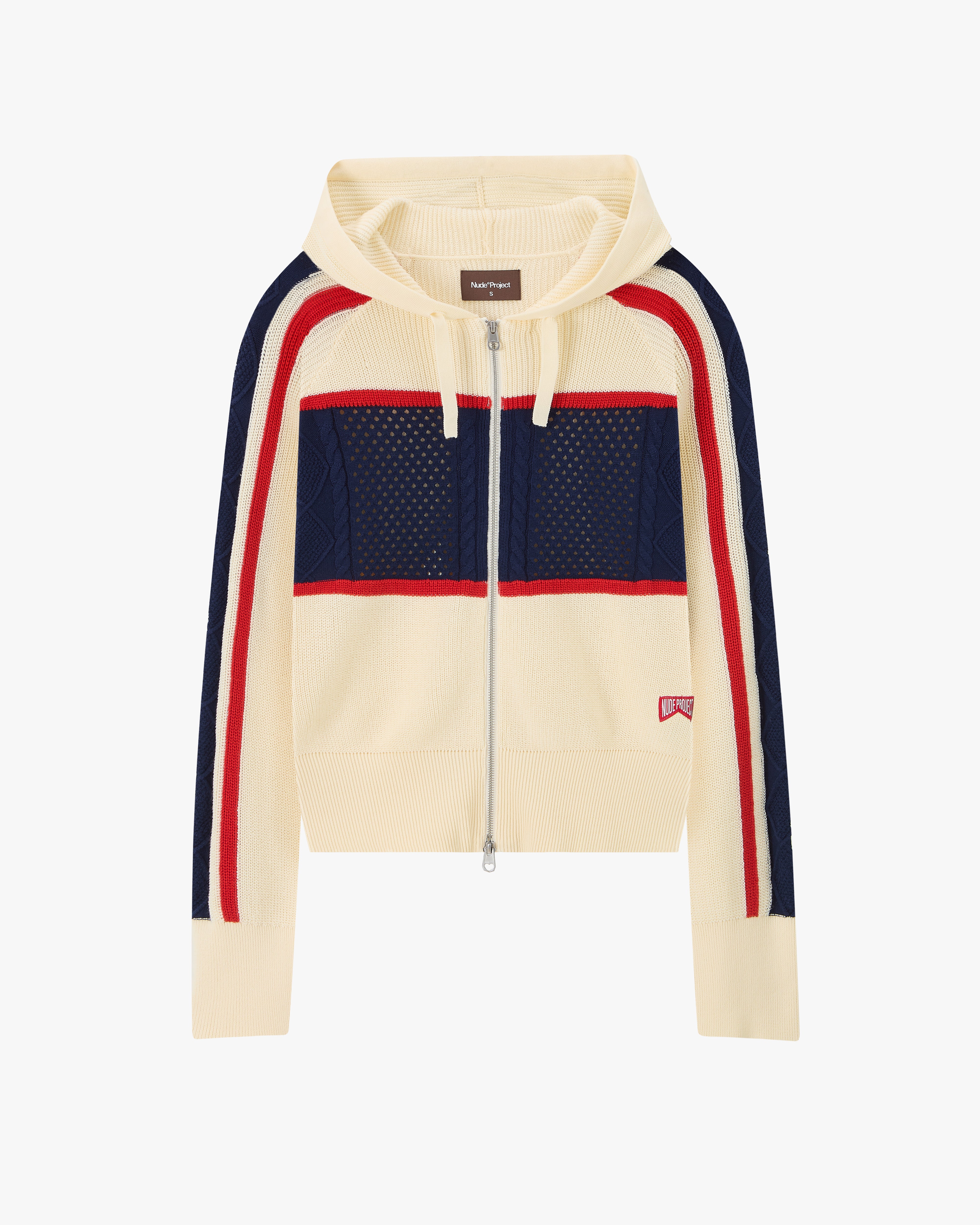 Contrast paneled full zip hoodie with mixed structures. woven decorative label on side seam.