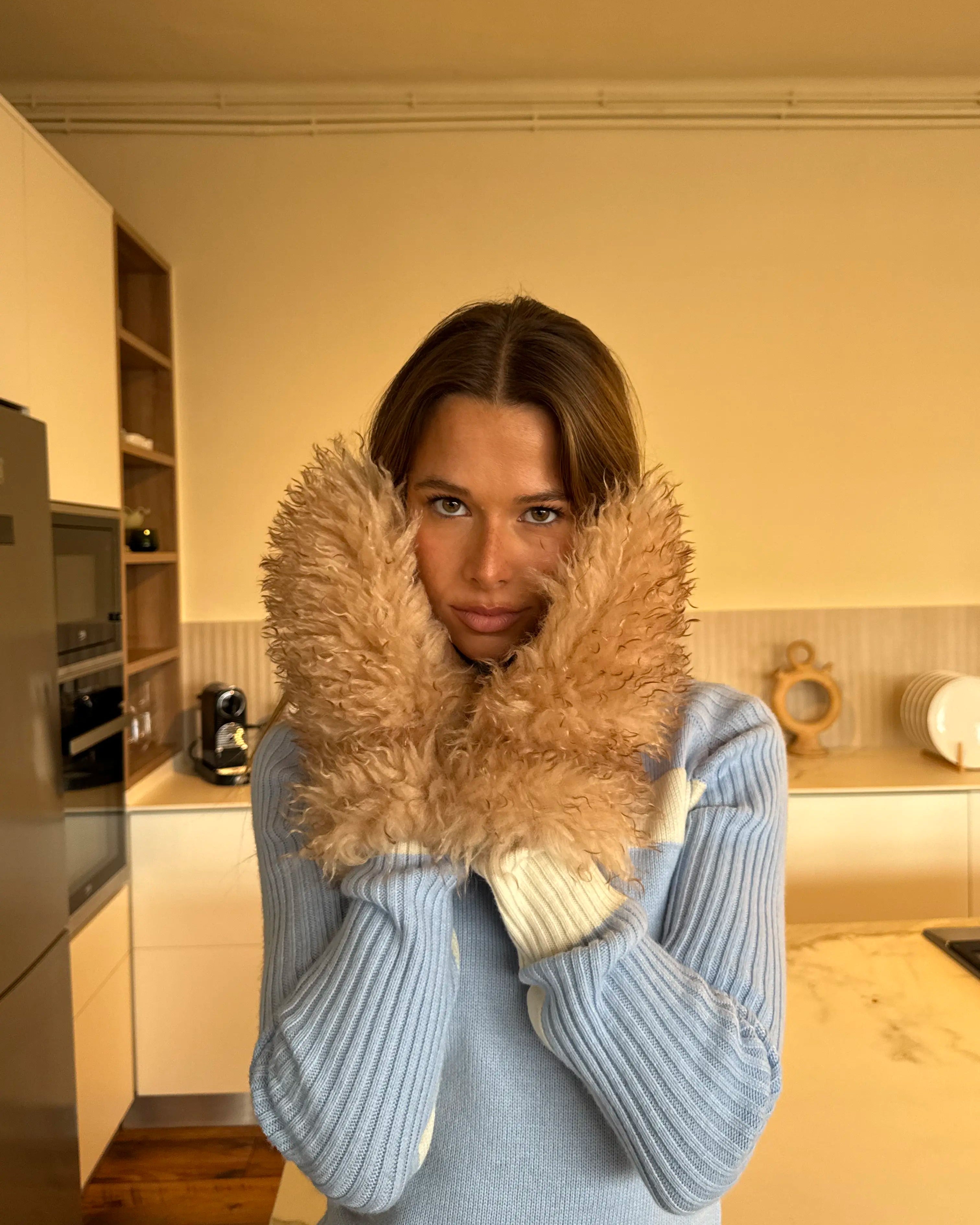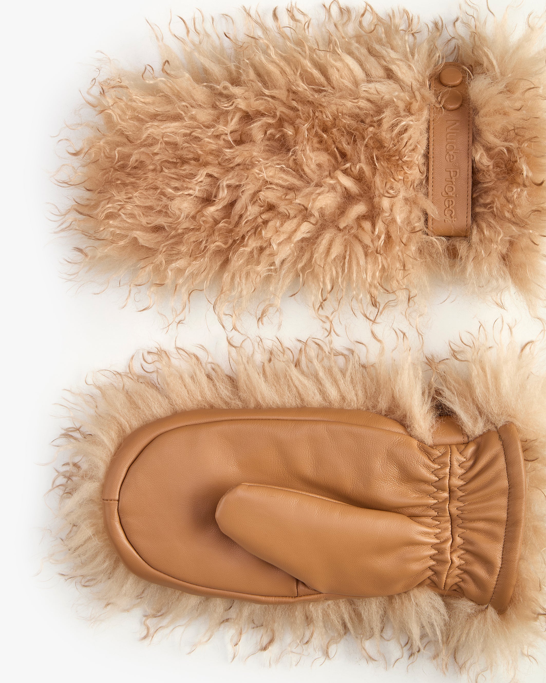 Hairy mittens with embosed logo at the adjustable strap. Front part made in fur hair and inner part in real leather.