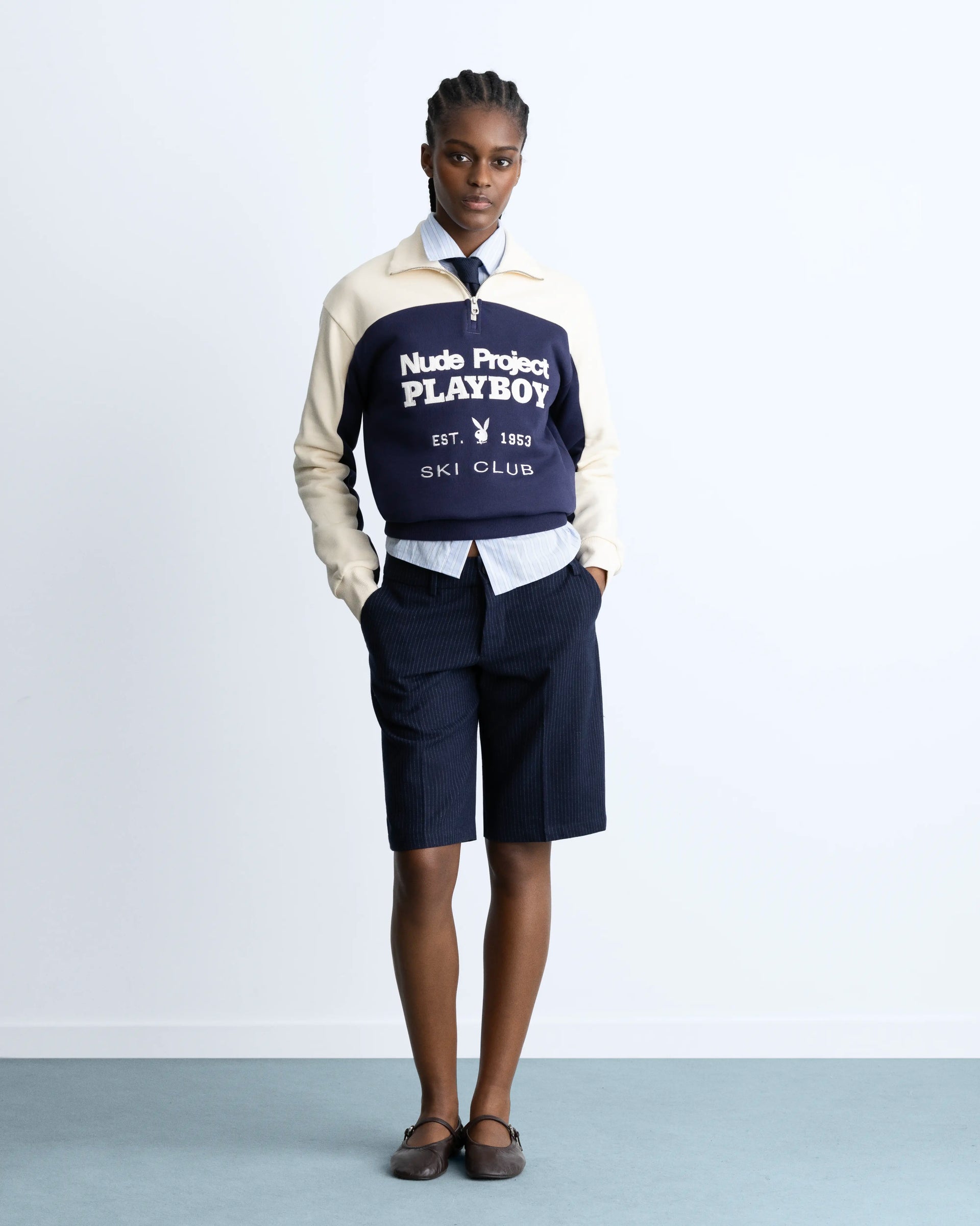 Colorblock half zip with woven applique and chanstitch embrodery artwork