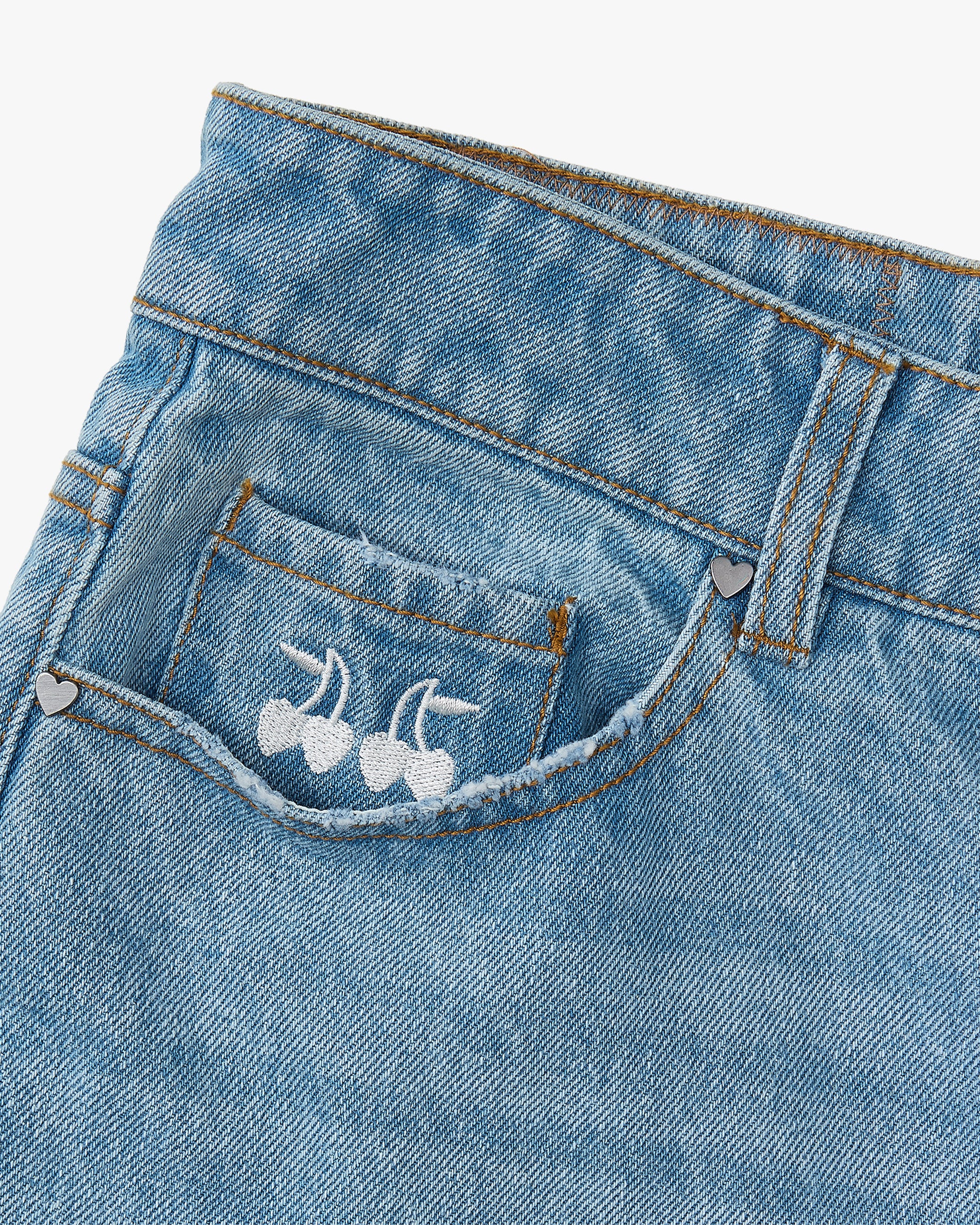 Custom metal trims distress effects on the hem special worn effect with metallic wash and whiskers