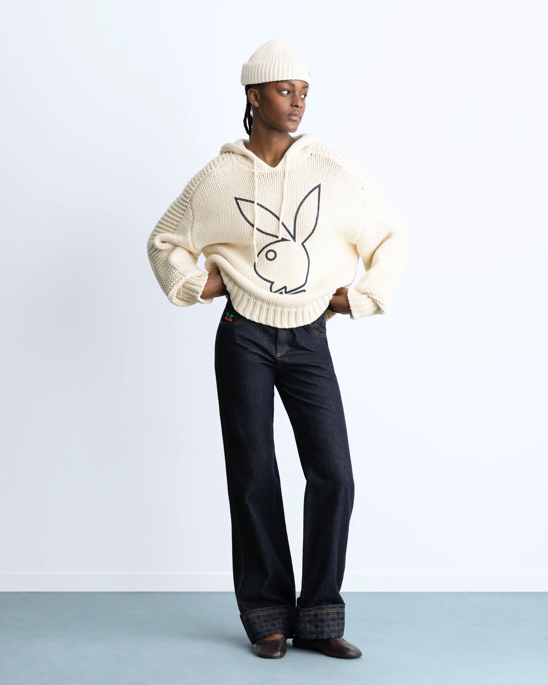 Huge knit hoodie with mixed structures, screen print front artwork and decorative label on back